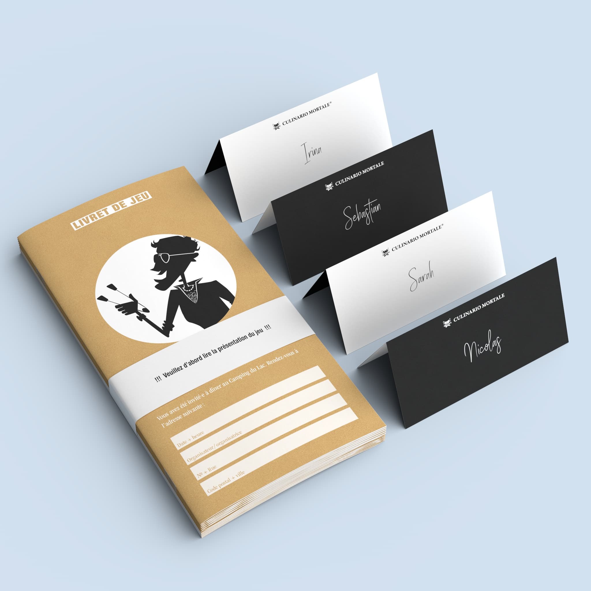 Grâce au code d’accès de votre dîner-enquête, vous pouvez facilement télécharger les descriptions des personnages au format PDF et les envoyer à vos invité·es. Cela simplifie considérablement la préparation.